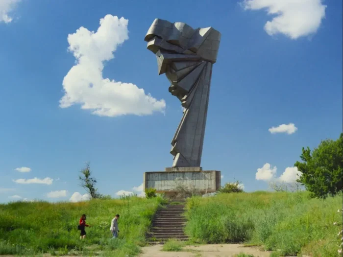 In Jude’s amazing 2018 film I Do Not Care If We Go Down in History as Barbarians, he interrogates the history of Romania, but more so the myths and lies it tells to itself. This is his territory: it’s where his creativity lies, and it’s creativity spiced with humor, absurdism, surrealism, and insightful political satire: I mean, even beyond satire. He lamPOONS things. National narratives are erected to obscure or even invent a truth. National narratives are designed to control. These are dangerous Orwellian concepts. As Orwell laid out in 1984: Real power does not lie in controlling the present. Real power comes when you can control the PAST. Millions of lives are impacted directly by invented national truths. Jude goes after these truths. He explored this as well in 2022’s Bad Luck Banging or Loony Porn, in my Top 10 of that year, although Bad Luck Banging was more about Right Now (in fact, it’s one of the most Right Now films I’ve seen in the past 5, 6 years, where every filmmaker appears to be trying to comment on our current moment. Nobody nailed the absolute STUPIDITY of Right Now better than Jude in Bad Luck Banging.) In all Jude’s work, history looms alongside the present, but it’s not DEALT with in an honest way. Truth doesn’t just EXIST in and of itself. This makes sense considering Romania’s 20th-century history. Living for decades under the monstrous personality cult surrounding Nicolae Ceaușescu distorts reality. The past is destroyed, lied about. The present is obscure. There’s no valid way to get trustworthy information. The personality cult surrounding Ceaușescu rivaled and in some cases surpassed the personality cult of Stalin. So Jude, a very Right Now guy, attempts to piece together what the hell happened. The Potemkinists is a short film showing a sculptor (Alexandru Dabija) pitching a new sculpture idea to a government bureaucrat (Cristina Draghici). The bureaucrat is distinctly unimpressed. They climb up these concrete steps to a famous ridiculous statue overlooking one of those monstrous canals built during the Stalinist years (millions died building these fucking things). The statue was erected to honor Communist Youth or some such bullshit, and the sculptor wants to re-do it. He wants to reveal the truth behind Sergei Eisenstein’s Battleship Potemkin — which, famously, ends in solidarity, where all the warring Russians realize they are brothers and comrades and shouldn’t be shooting at each other. But the REAL story (which I was unaware of) was that these mutinous sailors found asylum in Romania. In 1905, this was a clear act of aggression against Russia, and a slice of forgotten history. The sculptor wants to re-make the monument to Communist bullshit to honor the sailors – AND Romania – for its act of rebellion. The bureaucrat is distinctly NOT into it. The film is 18 minutes long and is spliced together with shots from Battleship Potemkin. I point you to J. Hoberman’s excellent essay in Art Forum about the film. It’s streaming on Amazon!